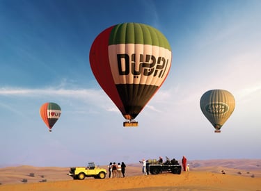 Soar 4,000 feet above the Margham Desert on a peaceful hot air balloon ride at sunrise. Enjoy up to 60 minutes in the air, followed by a gourmet breakfast at camp, a flight certificate, and 4x4 shared transfers with unlimited refreshments.
